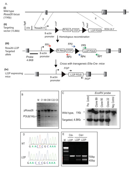 Conditional targeted knock-in mice at the ROSA26 locus. (A) Schematic of the construction of the conditional L22P floxed allele. (i) ROSA26 locus at chromosome 6 indicated as Exon 1, 2, and 3; (ii) Targeting construct of POLB; (iii) Targeted construct integrated at ROSA26 locus via homologous recombination; Targeted alleles in embryonic stem (ES) cells were genotyped using allele-specific PCR at three different regions of the construct using different primer sets that are indicated with red, blue, and green (all primers listed in Table S1); Linear plasmid digested with SgfI was electroporated into ES cells derived from the B6/129SvJ strain; Neomycin genes flanked by the loxP site and diphtheria toxin (DTA) were used for positive and negative selection, respectively. (iv) Breeding strategy of constructed L22P mice with Cre-expressing mice to generate L22P-expressing mice; (B) Cloning of the wild-type POLB gene into the AscI/XmaI site of a modified plasmid carrying loxp-STOP-loxp. The positive clone contains a Pol β gene insert (1 kB), and the 15 kB fragment is all loxP and DTA at ROSA26 loci and neomycine selection cassettes; (C) ES cells that were positive in PCR were confirmed using Southern blot hybridization. Southern blot analysis was performed on EcoRV digested genomic DNA extracted from the ES clones. Southern blotting reconfirms the integration of L22P Pol β at the ROSA26 locus; clones ES89, 90, and 22 are positive for the 4.8 kb integration size; (D) Sequencing of the cDNA amplified Pol β gene from L22P mice in order to reconfirm the codon of leucine (CTC) changes to proline (CCC); (E) ES clone 89 was used to generate mice and the F1 generation was crossed with EIIa-Cre mice (constitutive Cre). Mice were genotyped for the Cre transgene, L22P allele at the ROSA26 locus.