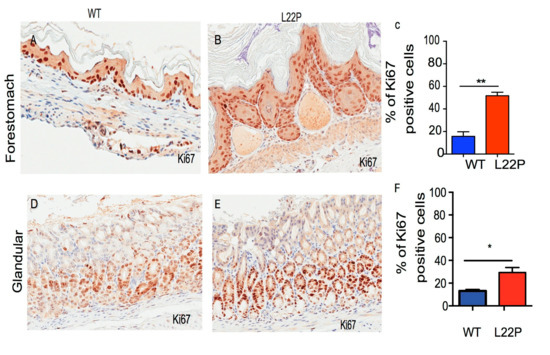 L22P mutation induces cellular proliferation in mice. (A,B) Representative image of forestomach tissue sectioned from wild type (WT) and L22P mice stained with Ki67 antibody proliferation markers; (C) Percent of cells positive for the Ki67 proliferation marker in forestomach of WT (n = 2400) and L22P (n = 2962) cells from forestomach. (D,E) Representative image of glandular stomach tissue sections from WT and L22P mice stained with Ki67; (F) Percent of Ki67 positive cells in WT (n = 6240) and L22P (n = 7750); Note that three mice from each group of WT and L22P genotypes were included to estimate the difference. The Mann–Whitney test was also applied to compare differences in Ki67 and statistical significance is designated by * p < 0.05; ** p < 0.01. All statistical analyses were performed using GraphPad Prism (Prism 7.00 for Mac, GraphPad Software, San Diego, CA, USA). All images shows 10× magnification and were captured using Scanscope (Leica Biosystem, Vista, CA, USA).
