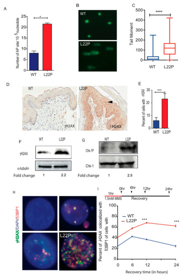 To determine whether L22P-expressing mice exhibit increased BER intermediates such as abasic sites (AP sites), we isolated DNA from stomach tissues using a DNAzole isolation kit and measured the number of AP sites using an AP site assay kit (Colorimetric; Abcam, Cambridge, MA USA). We found that cells from L22P mice had, on average, 22 AP sites/105 nucleotides compared with ~9 AP sites/105 nucleotides in cells from WT mice (Figure 3A). Furthermore, those processed AP sites likely induce single strand breaks (SSBs) in cells from L22P mice that are unable to repair. To determine whether L22P AP sites accumulate single strand breaks, we performed Alkali comet assays and found that SSBs significantly increase in L22P versus WT cells (Figure 3B,C; p < 0.0001). Our data suggest that imbalance between the generation of excess AP sites and inefficient repair in L22P mice stomach likely has the potential to lead to SSBs or may block DNA replication forks, resulting in DSBs. Previously, we provided evidence that L22P altered replication dynamics in human gastric epithelial cells [25]. To further determine whether the L22P mutation induces spontaneous DSBs in mice, stomach tissue sections were fixed and processed for immunohistochemistry using phosphorylated H2AX (γH2AX) as a DSB marker. We found that L22P mice exhibited a significantly increased frequency of DSBs compared with that of WT mice in the stomach tissue (Figure 3D,E; p < 0.001). Further, western blot analysis shows that γH2AX protein level was significantly higher in the L22P stomach than in the WT stomach (Figure 3F). To determine whether replication stress contributes to the production of DSBs in the L22P mouse stomach, we examined the Chk1 activation in the L22P stomach. We found that p-Chk1 (Ser317) activation was significantly increased in L22P stomach tissues (Figure 3G), suggesting that replication stress in L22P mice is a factor contributing to spontaneous DSBs. To examine whether exposure of alkylating agents (MMS) leads to accumulation of DSBs in L22P MEFs cells, we assayed γH2AX localization on WT and L22P MEFs cells by immunofluorescence. We stained cells with antibodies recognizing 53BP1 and γH2AX. Our data show that γH2AX and 53BP1 colocalization significantly increased in L22P MEFs versus WT MEFs (Figure 3H) suggesting that the number of DSBs in L22P MEFs cells accumulate up to six hours after MMS treatment (Figure 3H). In contrast, the percentage of γH2AX-positive cells was significantly decreased in WT cells after twelve hours of recovery from MMS treatment (Figure 3I). Our data suggest that the number of DSBs is significantly increased in L22P cells during alkylating DNA damage.