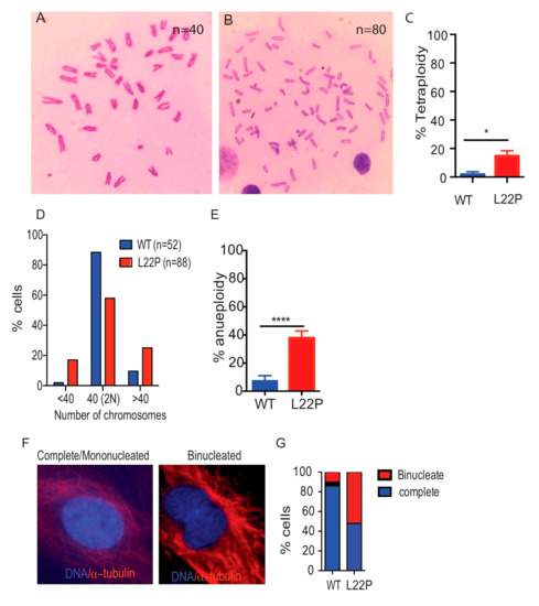 L22P cells cause abnormal number of chromosomes. (A) Representative image of diploid mouse embryonic fibroblast (MEF) chromosome spread with 40 chromosomes; (B) Tetraploid L22P MEFs cells chromosome spread with 80 chromosomes, All metaphase chromosome spread image were captured using 40× objective with bright field microscope; (C) Percent of tetraploid MEFs; (D) Histogram of chromosome spreads to show the spread of aneuploidy; (E) Average aneuploidy in MEFs (3 experiments of 50 spreads each; (F) The image of cytokinesis during cell division in WT and L22P cells indicates mononucleated versus binucleated cells, respectively. All image captured wit 63x objective of Zeiss fluorescence microscope (Zeiss, San Diego, CA, USA); (G) Percent of cells with binucleate formation, cells that fail to complete cytokinesis, and cells with complete cytokinesis for WT (n = 137) and L22P (n = 65) cells. All statistical analyses were carried out with Student’s t-test, and statistical significance is designated by * p < 0.05; **** p < 0.0001. All data were analyzed using GraphPad Prism software (Prism 7.00 for Mac, GraphPad Software, San Diego, CA, USA).