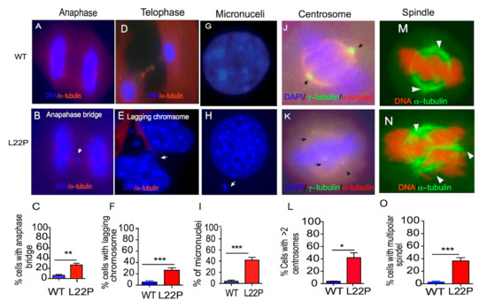 L22P cells exhibit mitotic defects. (A,B) Representative images of wild type (WT) and L22P cells with the anaphase bridge chromosomal segregation pattern; (C) Percent of cells with an anaphase bridge for WT (n = 62) and L22P (n = 57) cells; (D,E) Image of the lagging chromosomal structure in WT and L22P cells; (F) Percent of cells with lagging chromosomes at telophase for WT (n = 110) and L22P (n = 110) cells; the white arrow indicates lagging chromosomes; (G,H) Image of 4′,6-diamidino-2-phenylindole (DAPI)-stained nuclei from WT and micronuclei in L22P cells in H indicated with white arrow; (I) Percent of micronucleus-positive cells for L22P (n = 210) versus WT cells (n = 214). (J,K) Image of centrosomes stained for γ-tubulin and microtubules stained with α-tubulin antibody; the black arrow indicates the centrosomes; (L) Percent of cells with greater than two centrosomes for L22P (n = 168) versus WT (n = 120) cells; (M,N) Image of the assembly of cell poles stained for α-tubulin; the white arrow indicates two poles in WT versus the multiple assembly of tubulin in L22P cells; (O) Percent of cells with multipolar spindles >2 for WT (n = 109) and L22P (n = 87). All statistical analyses were performed with Student’s t-test and significance is represented by * p < 0.05; ** p < 0.01; *** p < 0.001 using GraphPad Prism (Prism 7.00 for Mac, GraphPad Software, San Diego, CA, USA). All images (A–N) were captured wit 63× objective of Zeiss fluorescence microscope (Zeiss, San Diego, CA, USA).