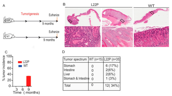 L22P increased tumor incidence and spectrum in mice. (A) Schematic representation of the tumorigenesis study’s experimental design (B) Representative tumor images wild type (WT) and L22P mice followed up for 9 months. Images of the stomach tissue sections shows 1× magnification (upper panel) and 10× magnification (lower panel) were captured using Scanscope (Leica Biosystem, Vista, CA, USA); (C) percent of tumor incidence in WT and L22P mice at 3 months (WT (n = 12); L22P (n = 13), 6 months (WT (n = 8); L22P (n = 18), and 9 months of experiment (WT (n = 15); L22P (n = 35); (D) Tumor spectrum was observed at 9 months of age.