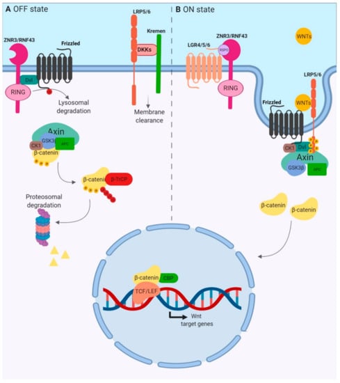 Overview of canonical WNT signaling. (A) OFF State. The absence of WNT ligands and the presence of antagonists such as DKK family members are associated with the inactive state of the pathway. The β-catenin destruction complex, formed by the scaffolding proteins AXIN and APC, and the kinases CK1α and GSK3, promotes the β-catenin phosphorylation, triggering its ubiquitination by the E3 ubiquitin ligase β-TrCP and its proteosomal degradation. (B) ON State. R-spondin (RSPO) and WNT ligands activate the pathway. RSPO binds both the ring finger proteins RNF43/ZNRF3 and the LGR receptor to form a ternary complex which is rapidly endocytosed. WNT glycoproteins are then able to bind Frizzled and LRP5/6 coreceptors, forming the WNT–FZD–LRP5/6 trimeric complex which recruits the scaffold protein Dishevelled (DVL) which itself polymerizes to bind AXIN. This promotes the formation of LRP6 signalosomes in which LRP6 is phosphorylated by CK1 and GSK3 kinases, releasing β-catenin, which accumulates and translocates into the nucleus to form an active transcription complex with TCF/LEF proteins.