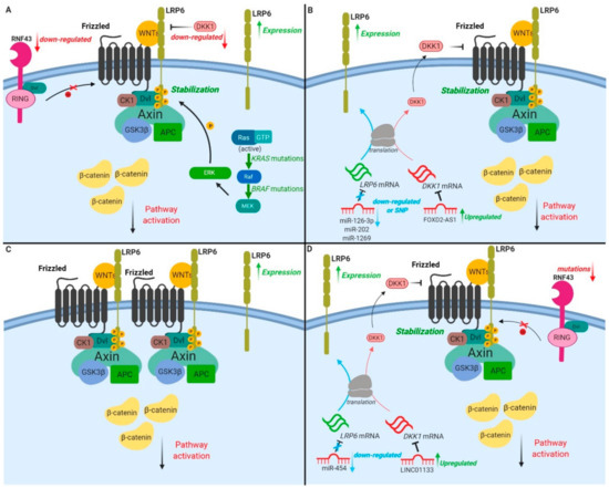 LRP6 and WNT/β-catenin pathway alterations in epithelial cancers. (A) In colorectal cancer (CRC), LRP6 overexpression is observed in 61% of malignant tissues isolated from patients. (i) Mutations in the E3 ubiquitin-protein ligase RNF43, (ii) downregulation of the antagonist DKK1 and (iii) overactivation of the RAS/MAPK pathway result in the recruitment of degradation complex components at the membrane and WNT/β-catenin pathway overactivation. (B) In hepatocellular carcinomas (HCCs), LRP6 is overexpressed in 45%–75% of HCC tumours. Downregulation of miR-126-3p, miR-202 and single-nucleotide polymorphism of miR-1269 result in increased LRP6 mRNA stability and protein levels. The long non-coding RNA FOX2-ASI, upregulated in HCC, targets and downregulates DKK1 mRNA (LRP6 inhibitor), thus increasing LRP6 membrane levels. (C) In breast cancers (BCs), LRP6 overexpression is observed in 20%–36% of carcinomas, and β-catenin nuclear accumulation is reported in 40%–60% of cases. (D) In pancreatic ductal adenocarcinoma (PDAC), (i) mutations of RNF43 are observed in 5%–10% of PDAC patients, (ii) down-regulation of miR-454 and (iii) upregulation of LINC01133—a long non-coding RNA which induces DKK1 promoter methylation (decreasing DKK1 expression)—all explain increased LRP6 expression and subsequent increased β-catenin-dependent signaling.