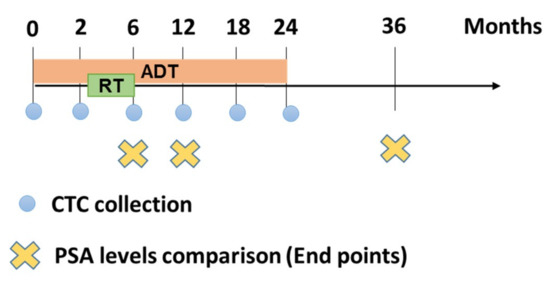 One hundred PCa patients had their CTCs collected every six months for 2 years (Figure 1). The CTCs were collected using a size-based filtration technique (ScreenCell), which allows for the isolation of PCa CTCs in patients with low-, intermediate-, and high-risk disease [28]. Figure 1 shows a timeline summary of the treatment and PSA/CTC collection points over the course of the study. CTCs were collected and analyzed at different time points until 24 months and PSA levels at 6 months after continued ADT, 6 months after finished RT, and 12 months post-initial treatment (36 months) were used as early surrogates of treatment response.