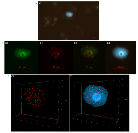 Example of a circulating tumor cell from a high-risk localized prostate cancer patient captured on top of a filter pore (A) (The arrows show empty filter pores). The prostate cancer CTCs are recognized based of their AR positive staining (B). (B1) Two-dimensional image showing a CTC AR+ in FITC (green); (B2) CTC with the telomeres labeled with telomere-specific Cy3-labeled probe (red); (B3) Merge between FITC and telomeres; and (B4) CTC counterstained with DAPI in blue. In C (C1 and C2), the same cell is shown in three-dimensional representation. Red spots represent telomere signals; and the blue is DAPI.