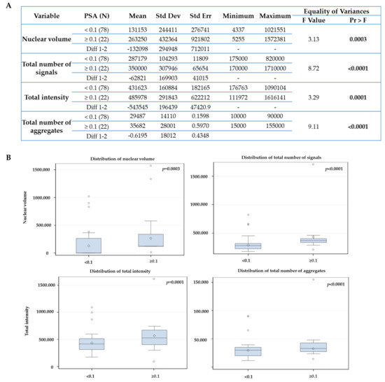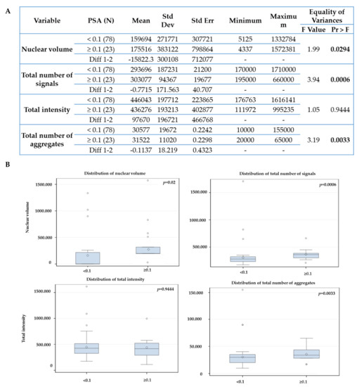 Statistical analysis comparing the telomeres parameters at 0 month with PSA value at 36 months after initial therapy using 0.1 ng/mL cutoff (A). (B) Box-plots generated by Statistical Analysis Software v. 9.4. The box is divided in the following way: —the median is the middle line, the 50th percentile- the top of box is the 75th percentile- the bottom box is the 25th percentile. Concerning the whiskers, the upper top of whiskers represent the max observation 1.5× (interquartile range (IQR)—75th percentile minus 25th percentile), while the bottom of whiskers represent the minimum observation 1.5× (1QR from 25th). The observations plotted are outliers- beyond the 1.5× IQR or below. The sign in the box is the mean. The box indicates where 50 percent of the observations lies, extending to the whiskers indicates where most of the data lies and the points outside are extremes.