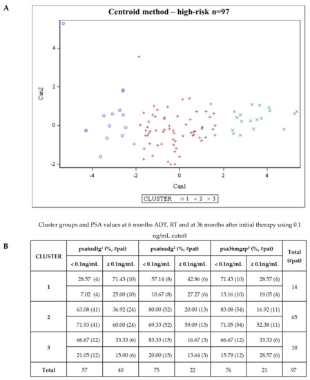 Second, we performed a hierarchical centroid cluster analysis, which combines all TeloViewTM data for each patient. The TeloViewTM data includes all parameters (nuclear volume, total number of signals, total intensity and total number of aggregates) provided for each telomere. Three patients were excluded from the analysis. The remaining ninety-seven patients were grouped into three subgroups (clusters 1-3) (Figure 7). The three clusters identified from 3D telomere profiling data, after hierarchical centroid cluster analysis, distinguished patients with different levels of genomic instability and different risk of future prostate mortality, based on their PSA end values after 6 months of ADT, 6 months of RT, and 36 months after initial treatment (Figure 7). Supplementary Table S1 shows all patients classified in the three clusters. Cluster 3 contains predominantly high-risk patient for future prostate mortality. Cluster 3 had approximately 30% of patients with PSA end value above 0.1 ng/mL after 6 months of ADT which decreased to 16.67% after RT and return to 30%, after 36 months of initial treatment. In contrast, clusters 1 and 2 had lost the fluctuation in their PSA end values after ADT, RT, and 36 months of ADT. Cluster 3 comprises 18.55% of the patients in this study. Supplementary Table S1 shows all patients classified into the three clusters. Additionally, patients classified as clusters 1, 2, and 3, had different disease aggressiveness (cluster 3 > cluster 1 > cluster 2) based on their genomic instability pattern detected by 3D telomere analysis.