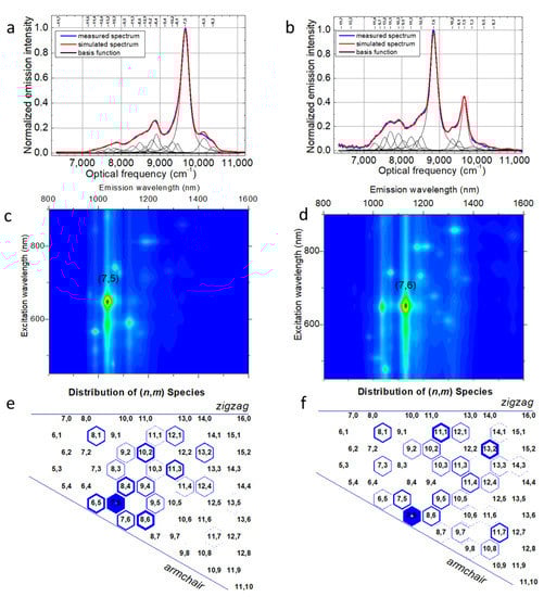 - Weisman, R.B.; Bachilo, S.M. Dependence of Optical Transition Energies on Structure for Single-Walled Carbon Nanotubes in Aqueous Suspension: An Empirical Kataura Plot. Nano Lett. 2003, 3, 1235–1238. [Google Scholar] [CrossRef]