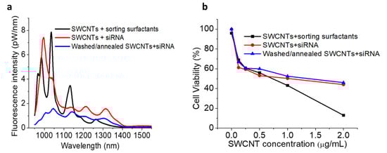 (a) Fluorescence spectra of raw SWCNTs dispersed with sorting surfactants, raw SWCNTs dispersed with siRNA, and SWCNTs washed/annealed for surfactant removal and re-dispersed with siRNA showing similar peak positions for raw SWCNTs dispersed with siRNA and washed/annealed SWCNTs dispersed with siRNA. (b) Cell viability of HepG2 cells subject to SWCNTs dispersed with sorting surfactants, raw SWCNTs dispersed with siRNA, and SWCNTs washed/annealed for surfactant removal and re-dispersed with siRNA.