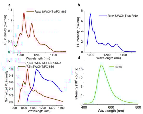 Emission spectra of raw CoMoCAT SWCNTs dispersed with (a) PX-866, (b) siRNA. Emission spectra of (c) (7,5) and (7,6) sorted washed/annealed SWCNTs dispersed with PX-866 and CCR5 siRNA, respectively. (d) Visible emission spectrum of PX-866 with 400 nm excitation.