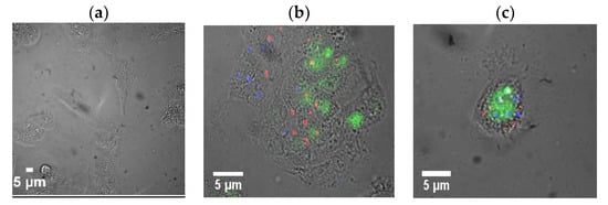 Brightfield/fluorescence overlay images of (a) untreated control HepG2 cells and (b,c) cellular uptake of (7,5) sorted SWCNTs imaged at 1030 nm (red), (7,6) sorted SWCNTs imaged at 1130 nm (blue), and PX-866 imaged at 535 nm (green) after the intracellular release.