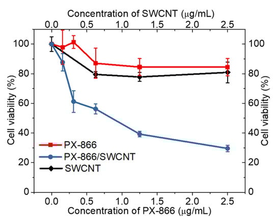 MTT assay cell viability of HepG2 cells treated with either SWCNTs, PX-866, or SWCNT/PX866 conjugates.