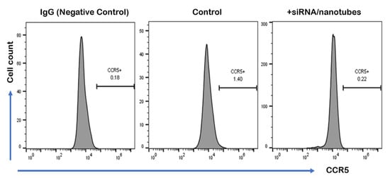 The efficacy of SWCNT/siCCR5 formulation was evaluated by assessing the CCR5 siRNA-mediated knockdown in HepG2 cells after 48 h transfection via flow cytometry, as CCR5 is known to be expressed in HepG2 cells [70]. SWCNTs-formulated siRNA transfection showed much lower expression of chemokine receptor type 5 (CCR5) as compared to the natural expression exhibited in the control sample (Figure 7), indicating substantial (over 90%) knockdown above or comparable to that regularly achieved by lyposomally delivered siRNA [18,71,72].