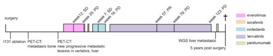 Various targeted agents (everolimus, sorafenib, nintedanib, lenvatinib, and panitumumab) were administered, based on approved status, or availability within the frame of trials, consecutively, in a time frame of four years. Because of a quick clinical progression due to metastasis, the patient’s death was within five years after surgery.