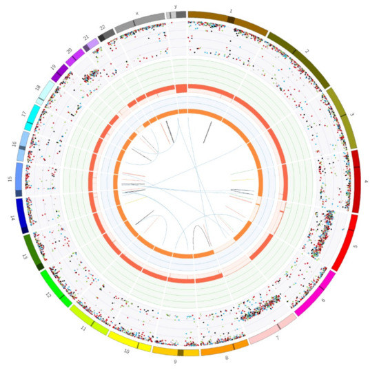 Circos plot showing a near-homozygous genome in HCC was detected by whole genome sequencing performed on biopsy material obtained from a metastatic hepatic lesion in the presented male patient case. LOH in all autosomes except for 5, 7, and 20. The outer first circle shows all chromosomes and the second circle shows all somatic variants (allele frequencies have been corrected for tumor purity and scale from 0% to 100%). The fourth circle represents the observed ‘minor allele copy numbers’ across the chromosome. The range of the chart is from 0 to 3 and the expected normal minor allele copy number is 1. Anything below 1 is shown as a loss (depicted in orange) and represents an LOH event.
