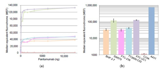 Cells (0.5 million/test tube) were spun down (500 g, 5 min, and 4 °C). Fifty µL in PBS/1%BSA (1% PBA) diluted panitumumab (range 1 ng–2 µg) was added to the cell pellets and gently vortexed. Cells were incubated for 60 min on ice. Next, cells were washed twice with PBS and a secondary reagent was added (GaHIgG1-FITC, 1 µg in 50 µL, SouthernBiotech, Birmingham, AL) to the pellet, mixed, and incubated for another 60 min on ice in the dark. Cells were washed twice with PBS. Lastly, 500 µL of 1% PBA was added containing 1 µM of propidium iodide staining dead cells, vortexed, and stored on ice in the dark for 30 min prior to the analysis on an LSRII flow cytometer (BD Biosciences). A blue 488 nm 20 mW laser was used for excitation. A threshold was set on the FSC detector. The FSC-W vs. FCS-H and SSC-W vs. SSC-H were used to gate out doublets during acquisition. For quantitative flow cytometry, Cyto-CalTM calibration beads (Cat No. FC3MV, ThermoFisher, Fremont, CA) were used according to the manufacturer’s instructions, which allows the presentation of EGFR expression in terms of molecular equivalent fluorochrome (MEF). FITC fluorescence or green fluorescence equivalent (beads) was collected using a 530/30 band pass filter. An FSC-A vs. PI-A fluorescence life gate was used for dead cell discrimination and 20,000 single live cell events were collected for each measurement. A data file contained all events, including debris and aggregates. Data were analyzed using WinList 8 (Verity Software House, Topsham, ME).