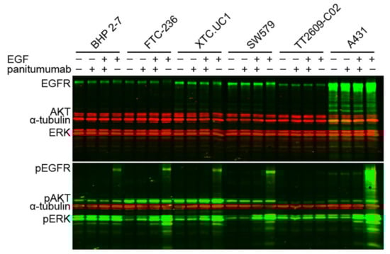 Immunofluorescent Western blots. Thyroid cancer cell lines (BHP 2–7, FTC-236, XTC.UC1, SW579, TT2609-C02) and the EGFR overexpressing control A431, were either serum-starved (−) or treated (+) with panitumumab for 1 h (20 µg/mL) and stimulated with (+) EGF from mouse for 10 minutes (100 ng/mL) or EGF unstimulated (−). A housekeeping protein, anti-α-tubulin antibody was used as loading control. The presence of EGFR, AKT, and ERK proteins in all cells, was confirmed by Western blotting. The same lysates were analyzed by Western blotting with phospho-EGFR (pEGFR), phospho-AKT (pAKT), and phospho-ERK (pERK) antibody. EGF induced EGFR phosphorylation (lane four of each cell line, compared to lane one) in all cell lines, except for TT2609-C02 (NRAS mutation). Panitumumab alone did not alter the EGFR phosphorylation status (lane 2, control). EGF-induced pEGFR phosphorylation was inhibited by panitumumab (third lane compared to the fourth). pERK showed a partial effect to panitumumab, in BHP 2–7, and TT2609-C02 pERK seems constitutively activated. pAKT seems constitutively activated in all cells (at low levels in TT2609-C02), and at significantly higher levels in the NHG harboring FTC-236 and XTC.UC1 cells in particular. Four gels were used in the same run (BHP 2-7, FTC-236, XTC.UC1 loaded onto one gel for the protein, comprising the 12 vertical lanes on the upper left, and another one for phosphoprotein markers respectively, depicted on the left below. SW579, TT2609-C02, and A431 were depicted onto the other two gels on the right). All gels were prepared simultaneously from the same mixture and all experimental procedures were run and processed simultaneously (also see Supplemental Figures S3–S6).