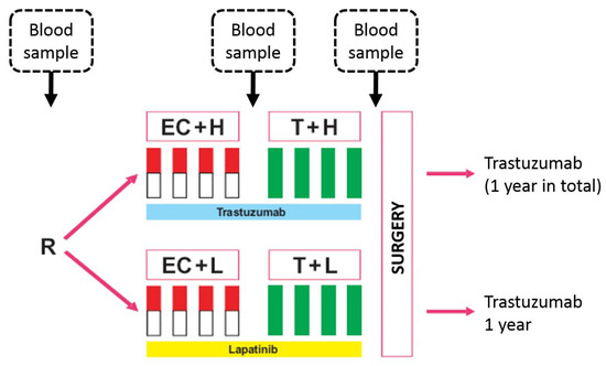 - Untch, M.; Loibl, S.; Bischoff, J.; Eidtmann, H.; Kaufmann, M.; Blohmer, J.U.; Hilfrich, J.; Strumberg, D.; Fasching, P.A.; Kreienberg, R.; et al. Lapatinib versus trastuzumab in combination with neoadjuvant anthracycline-taxane-based chemotherapy (GeparQuinto, GBG 44): A randomised phase 3 trial. Lancet. Oncol. 2012, 13, 135–144. [Google Scholar] [CrossRef]
