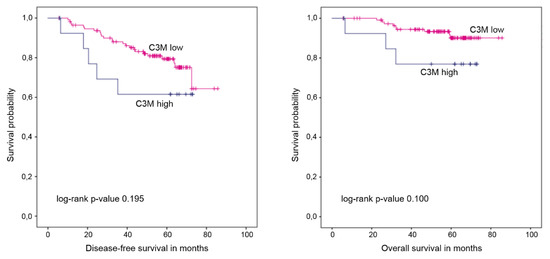 Kaplan–Meier plots of disease-free and overall survival stratified by C3M levels at baseline.