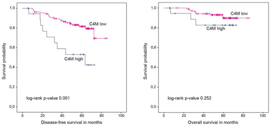 Kaplan–Meier plots of disease-free and overall survival stratified by C4M levels at baseline.