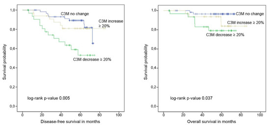 A decline of at least 20% in serum levels of C3M between baseline and after four cycles of therapy predicted significantly shorter DFS (p = 0.004, HR 3.55, 95%-CI 1.51–8.31) and OS (p = 0.022, HR 6.49, 95%-CI 1.31–32.23) (Figure 5, Appendix A Table A2). No association between changes in C4M levels and survival were observed.
