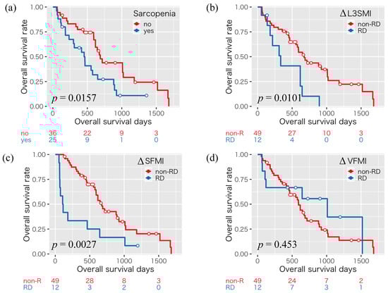 Kaplan–Meier curves for overall survival time divided into the presence or absence of sarcopenia (a) and rapid depletion (RD) or non-rapid depletion (non-RD) groups in ΔL3SMI (≤−5.73 and >−5.73 cm2/m2/120 days) (b), ΔSFMI (≤−5.33 and >−5.33 cm2/m2/120days) (c), and ΔVFMI (≤−3.95 and >−3.95 cm2/m2/120 days) (d).