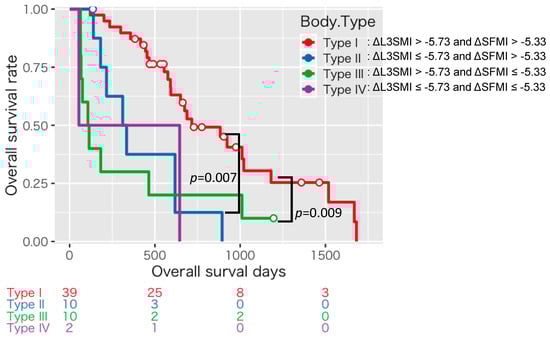 We then classified the enrolled patients into four groups according to the cutoffs for ΔL3SMI and ΔSFMI as described above; type I: Rapid depletion seen in neither ΔL3SMI nor ΔSFMI (n = 39), type II: Rapid depletion seen in ΔL3SMI alone (n = 10), type III: Rapid depletion seen in ΔSFMI alone (n = 10), and type IV: Rapid depletion seen in both ΔL3SMI and ΔSFMI (n = 2). The patients classified into type I had a significantly better survival than both type II (p = 0.007) and type III (p = 0.009; Figure 2).