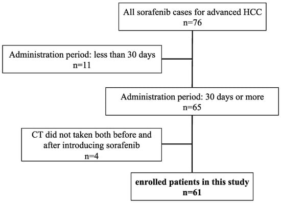 The patient selection in this study is shown in Figure 3. Among the 76 patients treated with sorafenib for advanced HCC in our hospital between May 2009 and December 2017, 11 were excluded because they did not take the agent for more than a month and 4 were excluded because they did not undergo abdominal CT before and after the introduction of sorafenib. The remaining 61 patients were enrolled in this study.