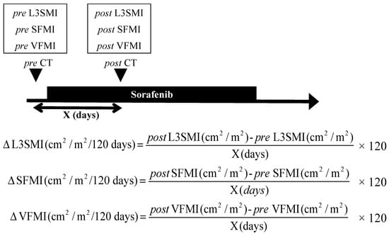 The differences in L3SMI, SFMI, and VFMI between post- and pre-sorafenib introduction were divided by CT examination interval to obtain ΔL3SMI, ΔSFMI, and ΔVFMI (cm2/m2/120 days), respectively. The outline and formula of ΔL3SMI, ΔSFMI, and ΔVFMI are shown in Figure 4.