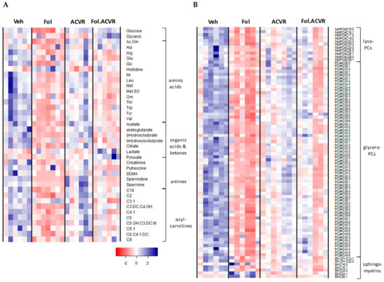 (A) Heatmap of serum metabolites including glucose, glycerol, amino acids, organic acids and ketones, amine, and acylcarnitines from mice treated with vehicle, Folfiri (Fol), ACVR2B/Fc, (ACVR), and the combination Folfiri plus ACVR2B/Fc (Fol.ACVR). Only metabolites that demonstrated at least one significant intergroup difference as evaluated by one-way ANOVA with Tukey’s multiple testing correction and p-value less than 0.05 are shown. (B) Heatmap of lipids including lysophospholipids (lysoPCs), glycerophospholipids (PCs), and sphingomyelins. A total of 130 metabolites are shown as z-scores in the heatmaps.