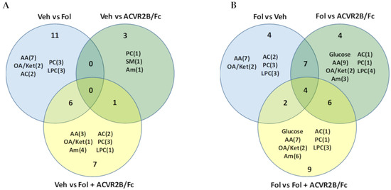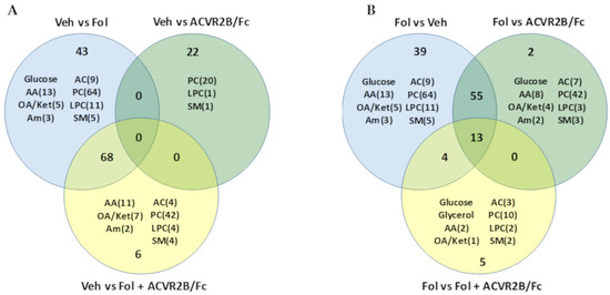 (A) Venn diagram of the differences in the muscle tissue extact metabolome between the vehicle treated group and the other three groups. Annotations inside each circle indicate the number of metabolites in different chemical classes that make up the differences. (B) Venn diagram of the differences between the Folfiri treated group and the other groups. AA, amino acids; OA/Ket, organic acids and ketones; Am, amines; AC, acylcarnitines; PC, glycerophosphcholines, LPC, lysophosphocholines; SM, sphingomyelines.