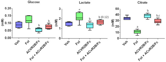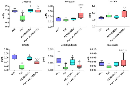 Muscle tissue extract metabolites representing central energy metabolism. Boxplots are shown with mean value, interquartile range, and whiskers that extend to the 10th and 90th percentiles. Significance differences include p-values < 0.05 for a vs. Veh, b vs. Folfiri, c vs. ACVR2B/Fc.