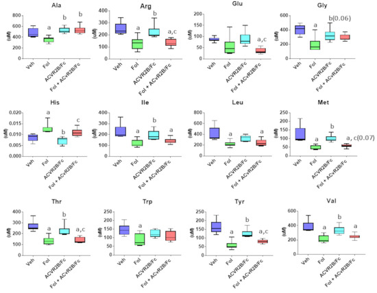 Serum levels of amino acids showing at least one significant inter-group difference. Significance differences include p-values < 0.05 for a vs. Veh, b vs. Folfiri, c vs. ACVR2B/Fc.
