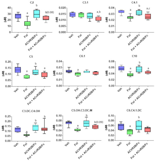 Serum levels of acylcarnitines showing at least one significant inter-group difference. Significance differences include p-values < 0.05 for a vs. Veh, b vs. Folfiri, c vs. ACVR2B/Fc. C2, acetylcarnitine; C3.1, propenoylcarnitine; C4.1, butenylcarnitine; C5, valerylcarnitine; C6.1, hexenoylcarnitine; C10, decanoylcarnitine; C3.DC.C4.OH, hydroxybutyrylcarnitine; C5.OH.C3.DC.M, hydroxyvalerylcarnitine; C6.C4.1.DC, hexanoylcarnitine.