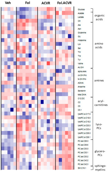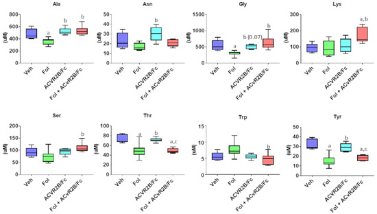 An examination of the effects on amino acids is shown in Figure 10. A total of eight amino acids presented a significant difference in at least one of the groups. Folfiri treatment yielded a significant decrease in four amino acids compared with the vehicle, while ACVR2B/Fc treatment alone did not result in any changes compared with vehicle. For the amino acids Ala, Gly, Lys, and Ser, co-treatment levels were significantly higher than treatment with Folfiri alone. In the case of Trp, levels in the presence of co-treatment were actually lower than Folfiri alone.