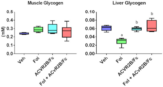The differences in the glucose levels in both the serum and muscle led us to examine the status of glycogen. As both muscle and liver are significant storage sites for glycogen, a biochemical assay for glycogen levels was run on both of these tissues. Figure 9 shows that no significant differences were observed in the levels of muscle glycogen, but there were indeed differences in the liver. As observed in the previous study, Folfiri treatment led to a depletion in the level of liver glycogen [5]. Treatment with ACVR2B/Fc resulted in no difference compared to vehicle, but interestingly, in the co-treatment group, liver glycogen returned to vehicle levels, demonstrating a rescue of Folfiri-induced glycogen depletion with ACVR2B/Fc treatment.