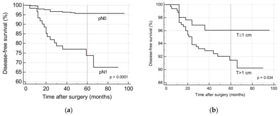 Kaplan-Meier curves for independent factors are reported in Figure 1a,b. Log-rank test demonstrated significant differences in survival curves both for lymph node metastases (p < 0.0001) and for microcarcinoma (p = 0.0304). Five-year disease-free survival was 95.8% in patients with negative lymph nodes and 73.7% in patients with metastatic lymph nodes, and 96.1% in patients with a microcarcinoma and 91.5% in patients with tumor >1 cm.