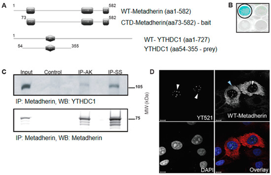 A human placental cDNA library and the metadherin C-terminal domain (CTD, amino acids (aa) 73–582) were used in a yeast two-hybrid assay, which identified aa54–355 of YTHDC1 as a metadherin-interacting domain (Figure 1A,B). The interaction between endogenous YTHDC1 and metadherin was confirmed in mammalian cells by immunoprecipitation using two anti-metadherin antibodies: AK (IP-AK) or SS (IP-SS) [29] (Figure 1C).