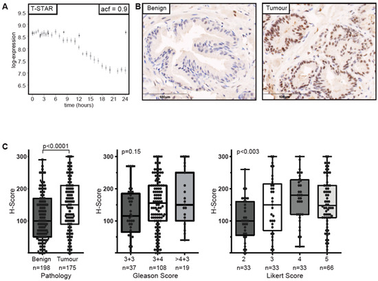 T-STAR is overexpressed in prostate cancer. (A) Androgen regulation of T-STAR determined by expression analysis of LNCaP cell lines treated with synthetic androgen (open circles) or vehicle control (filled circles) over 24hrs. ACF = autocorrelation function. (B) Examples of immunohistochemistry (IHC) of T-STAR showing benign (left) and tumour (right) tissue. Staining is shown in brown with nuclei shown in blue. (C) Staining was analysed by h-score and analysed based on pathology (left), Gleason score (centre) and Likert score (right). Dots represent individual patients, whiskers extend to the minimum and maximum data points, the boxes represent data from first to third quartile, and the horizontal line represents the mean. Significance was analysed using two-tailed Mann–Whitney test.