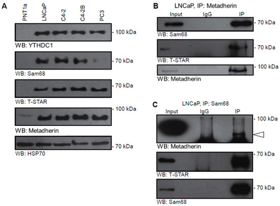 Given our observation that metadherin interacts with splicing protein YTHDC1, we clarified if there was also potential interaction with alternative splicing proteins T-STAR and Sam68. Our results demonstrated that there was a clear interaction between metadherin and all four splicing proteins cementing the assumption that metadherin associates with splicing machinery.