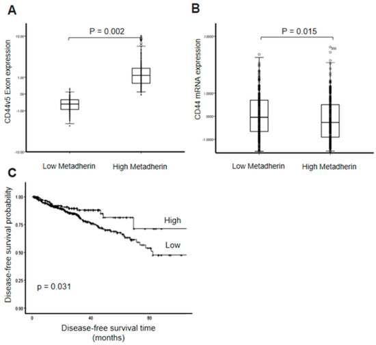 Finally, our evidence suggested a relationship between metadherin and the splicing of CD44 in vitro, however, it remained to be seen if a relationship existed in an endogenous context. To this end, we attempted to further confirm this in a patient cohort. The Cancer Genome Atlas (TCGA) prostate adenocarcinoma (PRAD) cohort was used to compare CD44v5 exon expression between patients with either high or low metadherin expression (separated by median expression). There was a significant increase in the expression levels of CD44v5 mRNA between patients with low and high metadherin expression (p = 0.002), concordant with our observation that increased metadherin results in greater inclusion of the CD44v5 exon leading to greater expression (Figure 5A). Another interpretation of this result may be that metadherin and CD44 are co-expressed leading to this pattern of expression. Comparing metadherin mRNA expression to that of full-length CD44 did reveal a weak but significant difference, however, in the opposite direction (p = 0.015) indicating that there was a specific effect on the inclusion of exon v5 in tumours with high metadherin expression not explained by simple co-expression (Figure 5B). To investigate the potential clinical significance of this relationship, we compared the disease-free survival of patients with high and low CD44v5 expression (expression was discretized into high and low expressers using the MaxStat R package). The comparison found a significant difference in disease-free survival between low and high expressers (p = 0.031) with median disease-free survival for low CD44v5 patients being 82.3 months and the median for high CD44v5 expressers, not reached (Figure 5C).