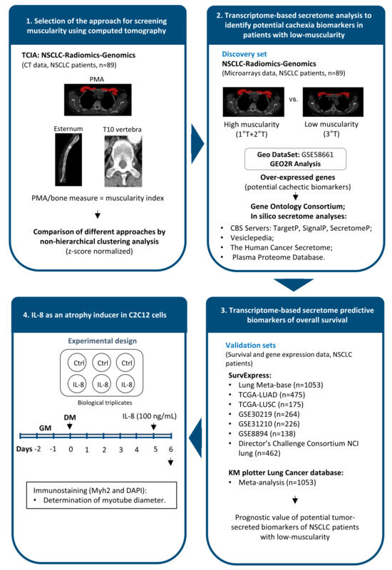 Herein, we analyzed a cohort of NSCLC patients with CT images, clinical findings, and tumor expression microarrays data from a previous study that decoded tumor radiomics features associated with gene expression levels [27]. For these patients, we compared the pectoralis muscle area with muscle normalizations based on different radiomics features to select an approach for screening muscularity. Next, we identified genes predicted to be secreted in patients with low-muscularity and assessed their prognostic value as tumor markers of recurrence-free survival and overall survival. Finally, we demonstrated the potential of interleukin (IL)-8 as a putative secreted marker capable of inducing atrophy in C2C12 myotubes.