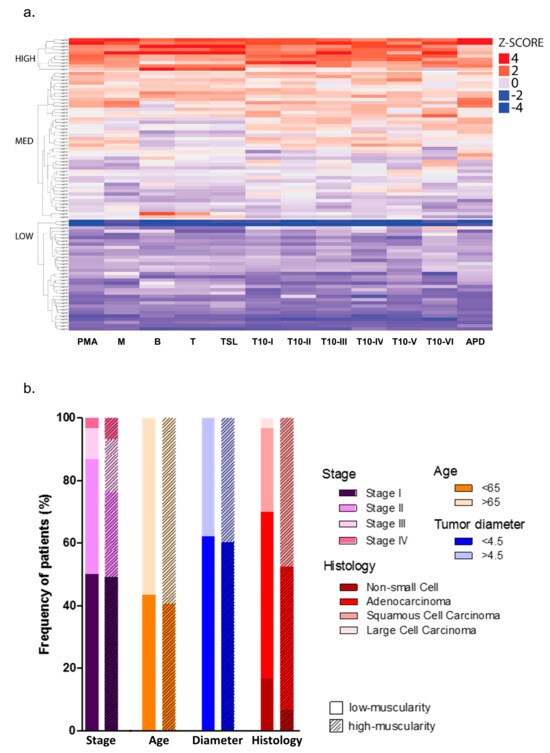 Pectoralis muscle area as an approach for screening muscularity. (a) Heatmap showing patients’ stratification into high-, medium-, and low-muscularity by non-hierarchical k-means clustering analysis of the pectoralis muscle area (PMA) and its normalization by eleven computed tomographies (CT) feature that includes: manubrium and sternum body lengths, six T10 (tenth thoracic) different measures, and an anteroposterior length. Manubrium length (M); sternum Body length (B); T (M+B); total sternum length (TSL); T10 body vertical length (T10-I); distance between T10 body and spinous process (T10-II); T10 body horizontal length (T10-III); distance between T10 pedicles (T10-IV); distance between T10 transverse processes (T10-V); T10 body area (T10-VI); anteroposterior distance (APD). (b) Bar graphs comparing the percentage of patients for clinical prognostic variables between high- and low-muscularity groups. These groups were generated based