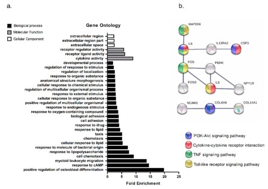 Over-expressed genes in tumors from patients with low-muscularity. (a) Enriched terms in gene ontology analysis of the 75 transcripts upregulated in patients with low-muscularity. (b) Protein-protein interaction (PPI) network of 75 upregulated transcripts in patients with low-muscularity generated by STRING (Search Tool for the Retrieval of Interacting Genes/Proteins) using a high confidence interaction score (0.700).