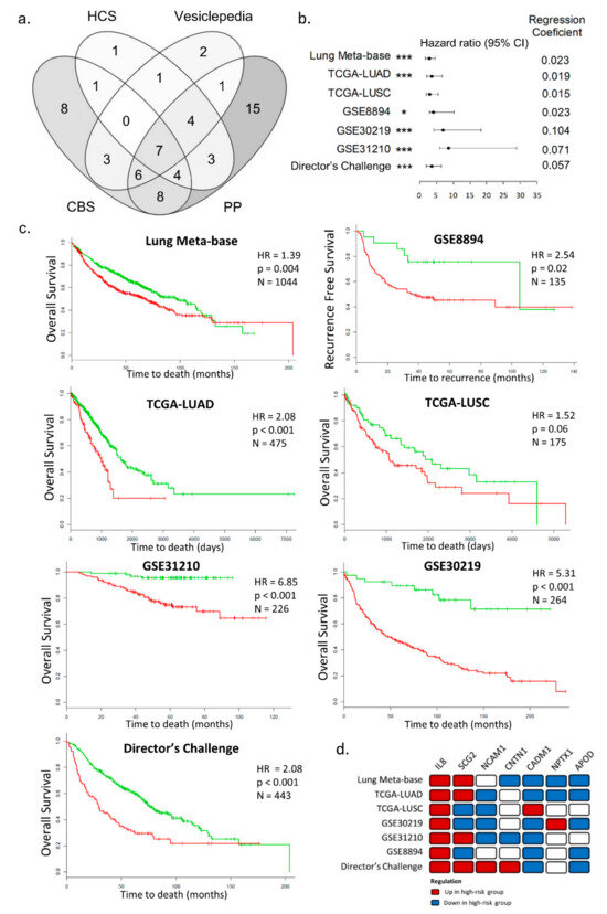 Prognostic values of the potentially secreted proteins in tumors from patients with low-muscularity. (a) The intersection of databases used for prediction of secreted proteins revealed seven overlapped proteins: interleukin-8 (IL-8), SCG2, NCAM1, CNTN1, CADM1, NPTX1, and APOD. (b) Forest plots representing the set of the seven potentially secreted biomarkers in each validation set. The horizontal axis represents confidence intervals estimated by using a Cox proportional hazards model. The asterisks represent the statistical significance in the patient survival outcome (*** p < 0.001 and * p < 0.05, log-rank p-value). (c) Kaplan-Meier plots generated in SurvExpress [33] database for the non-small cell lung cancer (NSCLC) datasets (gene expression and survival or time to recurrence): Lung Meta-base, TCGA-LUAD, TCGA-LUSC, GSE30219, GSE31210, and Director’s Challenge Consortium from National Cancer Institute (NCI). The Kaplan-Meier plot generated using the dataset GSE8894 was based on gene expression and time to recurrence data. (d) The direction of expression for the seven biomarkers in each validation set. HCS: Human Cancer Secretome; CBS: Servers TargetP, SecretomeP, and SignalP; PP: Plasma Proteome database; N: number of patients; HR: adjusted hazard ratio; p: log-rank p-value determined from univariate Cox regression analyses (green curve: low-risk group; red curve: high-risk group); TCGA: The Cancer Genome Atlas; LUAD: Lung Adenocarcinoma; LUSC: Lung Squamous Cell Carcinoma; IL-8: Interleukin-8; SCG2: Secretogranin II; NCAM1: Neural Cell Adhesion Molecule 1; CNTN1: Contactin 1; CADM1: Cell Adhesion Molecule 1; NPTX1: Neuronal pentraxin 1; APOD: Apolipoprotein D; GSE: Gene Expression Omnibus accession numbers.