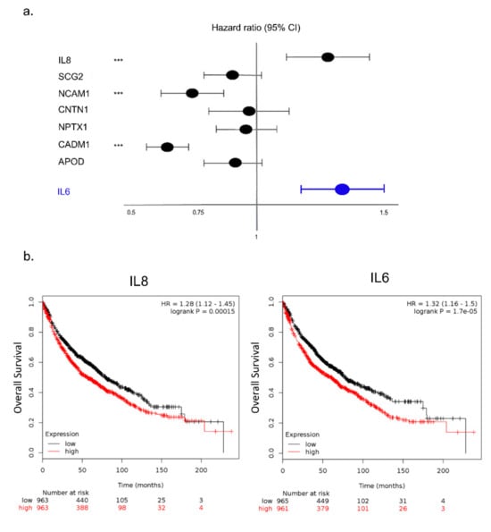 Interleukin (IL)-8 is associated with poor prognosis in non-small cell lung cancer (NSCLC). (a) Forest plot for each tumor biomarkers (IL-8, SCG2, NCAM1, CNTN1, CADM1, NPTX1, and APOD) in NSCLC patients from the dataset available on Kaplan-Meier (KM) plotter database. The hazard ratio (HR) with 95% confidence intervals (CI) determined by Cox proportional hazards model is represented in the horizontal axis. *** represent the statistical significance in NSCLC patient survival outcome (p < 0.001; log-rank p-value). (b) Kaplan-Meier overall survival curves for IL-8 or IL-6 in NSCLC patients from the dataset available on KM plotter [35] database. The resulting p-values for the log-rank test are shown. SCG2: Secretogranin II; NCAM1: Neural Cell Adhesion Molecule 1; CNTN1: Contactin 1; CADM1: Cell Adhesion Molecule 1; NPTX1: Neuronal pentraxin 1; APOD: Apolipoprotein D; IL6: Interleukin-6.