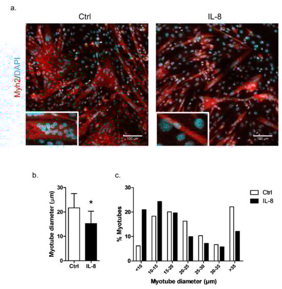 The ability of IL-8 in inducing muscle atrophy was evaluated by treating C2C12 myotubes with different concentrations of this cytokine (10, 100, and 1000 ng/mL). The myotubes treated with the supraphysiological dose of 100 ng/mL presented a significant decrease in diameter compared to the control group after 24 h (Figure S5). The C2C12 myotubes treated with 100 ng/mL of IL-8 for 24 h were evaluated by Myh2 (myosin heavy chain 2) immunostaining, which confirmed the significant decrease in myotubes diameter (Figure 6a,b). Myotubes treated with IL-8 also presented a higher number of myotubes with <10 µm of diameter compared to the control group. Conversely, a higher number of controls myotubes with >35 µm of diameter compared to those myotubes treated with IL-8 was observed (Figure 6c).