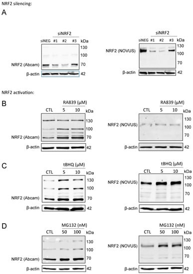 We used the Abcam (ab31163) antibody in our studies, which we validated, due to the ambiguity in the molecular weight of NRF2. The calculated molecular weight of NRF2 is 68 kDa, however, recent studies have claimed that NRF2 has a molecular weight of ~130 kDa [46,47]. In the validation studies, we used a second NRF2 antibody (Novus, NBP1-32822) which, according to the literature [46,47], recognizes the ~130 kDa form of NRF2. The signal from both antibodies decreased when NRF2 was silenced by siRNA (Figure 1A). NRF2 protein was stabilized when NRF2 activators (RA839 or tBHQ) (Figure 1B,C) or a proteasome inhibitor (MG132) (Figure 1D) were administered to the cells. Both high and low molecular weight bands behaved in a similar fashion regardless of the antibody used. In the upcoming experiments, we used the Abcam ab31163 antibody and quantitation was done based on the ~70 kDa band.