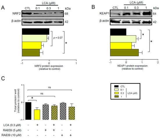 LCA inhibited the NRF2/KEAP1 system. (A,B) The 4T1 cells were treated with LCA in the concentrations indicated for 48 h, then (A) NRF2 and (B) KEAP1 proteins were analyzed by western blotting. (n = 3, upper panel: representative figure, lower panel: densitometric analysis of western blots from independent experiments). (C) The 4T1 cells were treated with 0.3 μm LCA and/or the NRF2 activator, RA839, in the concentrations indicated for 48 h, then total protein concentration was determined by sulforhodamine B assay (n = 5). Data are plotted as mean ± SEM. * indicates p < 0.05, control vs. LCA-treated groups. (ns, not significant; KEAP1, Kelch-like ECH associating protein 1; LCA, lithocholic acid; NRF2, nuclear factor).